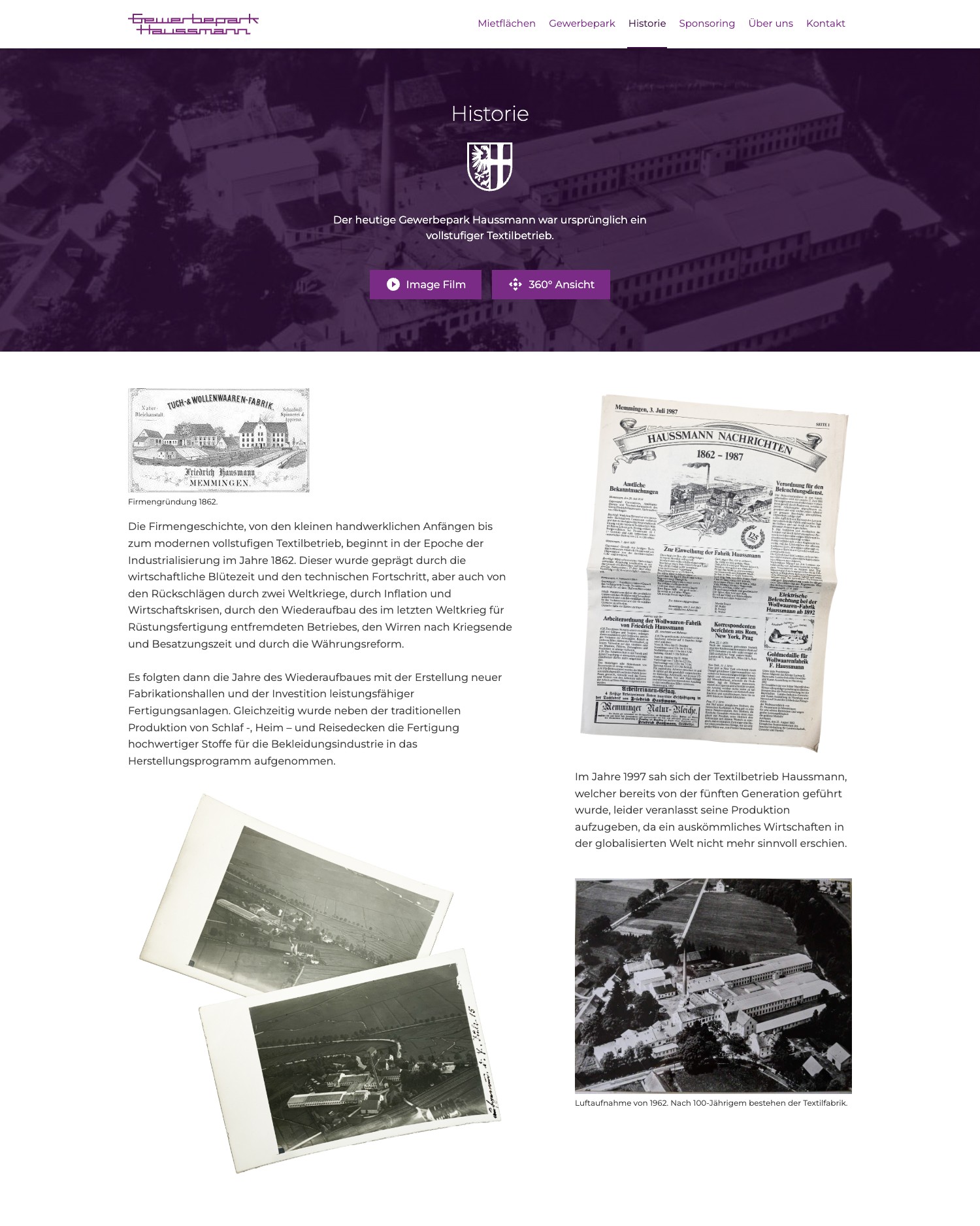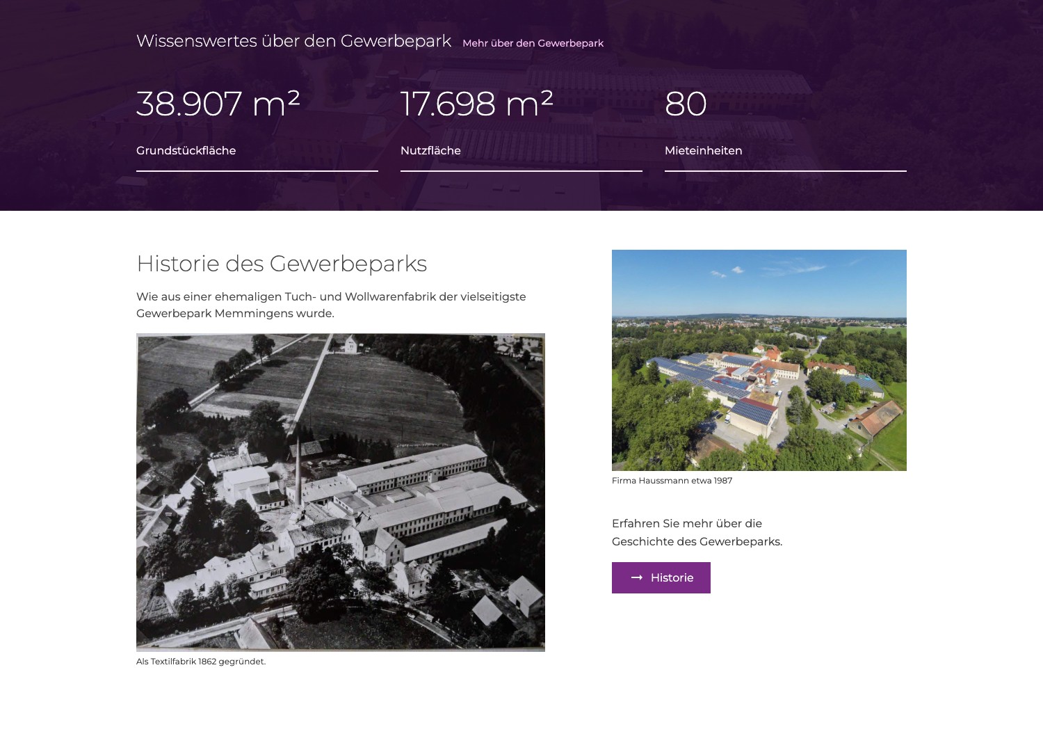 Eine eigene Historie-Seite erzählt die Entwicklung von der Textilfabrik (1862) zum heutigen Gewerbepark. Dazu: ein professioneller Imagefilm und eine interaktive 360°-Ansicht des Geländes. Interessenten erleben den Charme des Standorts, bevor sie einen Fuß auf das Gelände setzen.