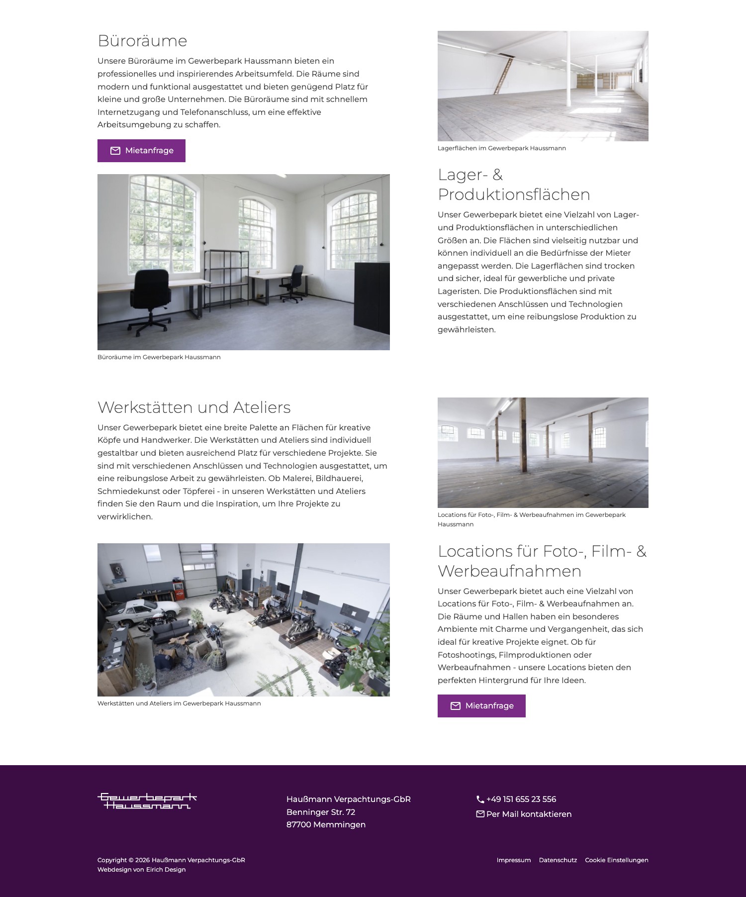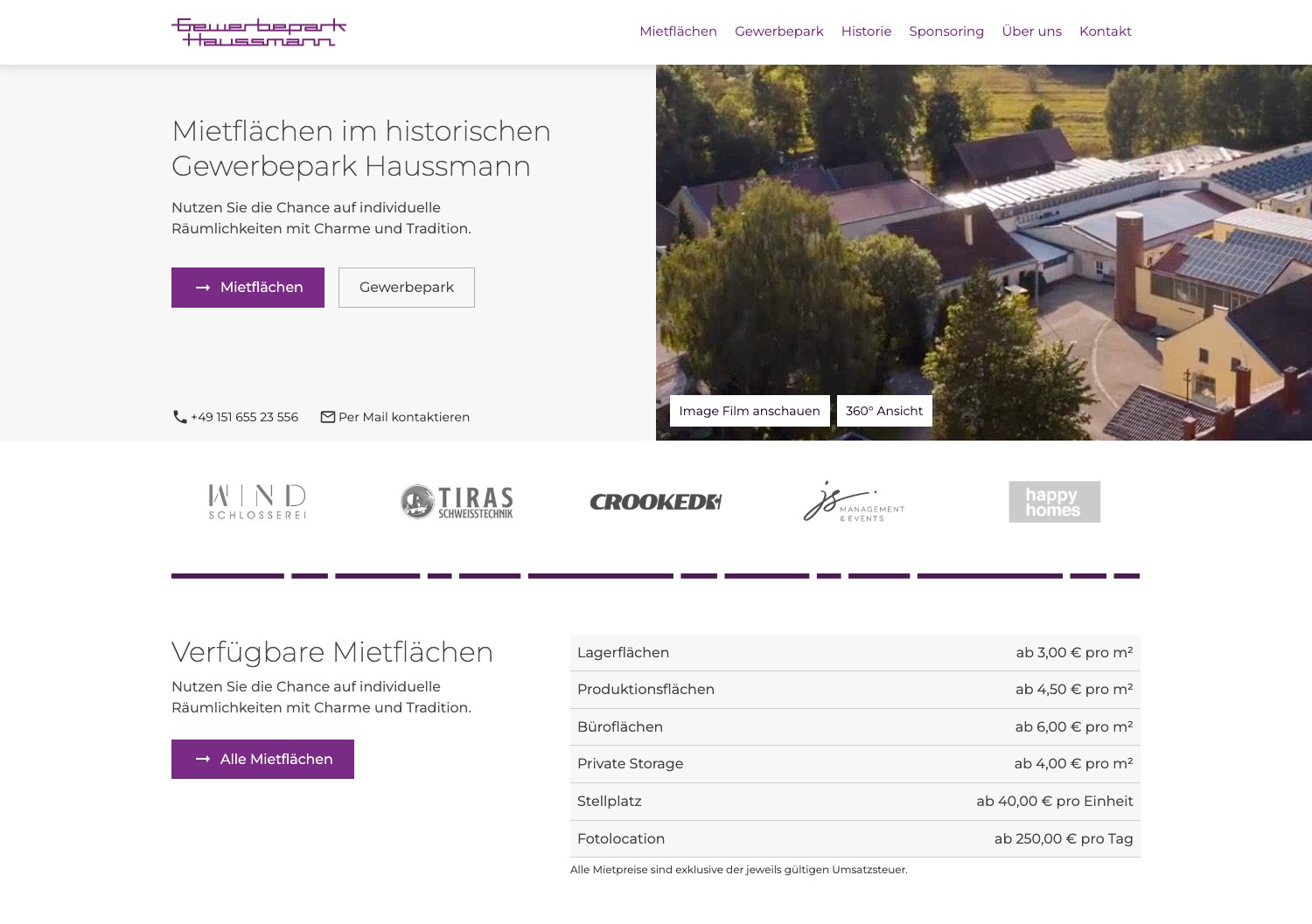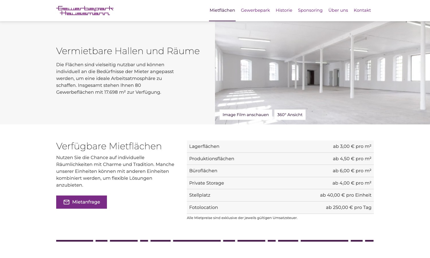 Der Gewerbepark Haussmann ist ein besonderer Standort: ein ehemaliges Textil-Fabrikgelände von 1862 mit Industriecharme, vielseitigen Flächen und einer gewachsenen Mietergemeinschaft aus Handwerkern, Dienstleistern, Kreativen und Lageristen. Dieses Potenzial war online kaum sichtbar. Interessenten mussten anrufen, um zu erfahren, welche Flächen verfügbar sind, was sie kosten und wie das Gelände aussieht. Ohne digitale Präsenz blieb ein Großteil des Geländes unter dem Radar potenzieller Mieter.