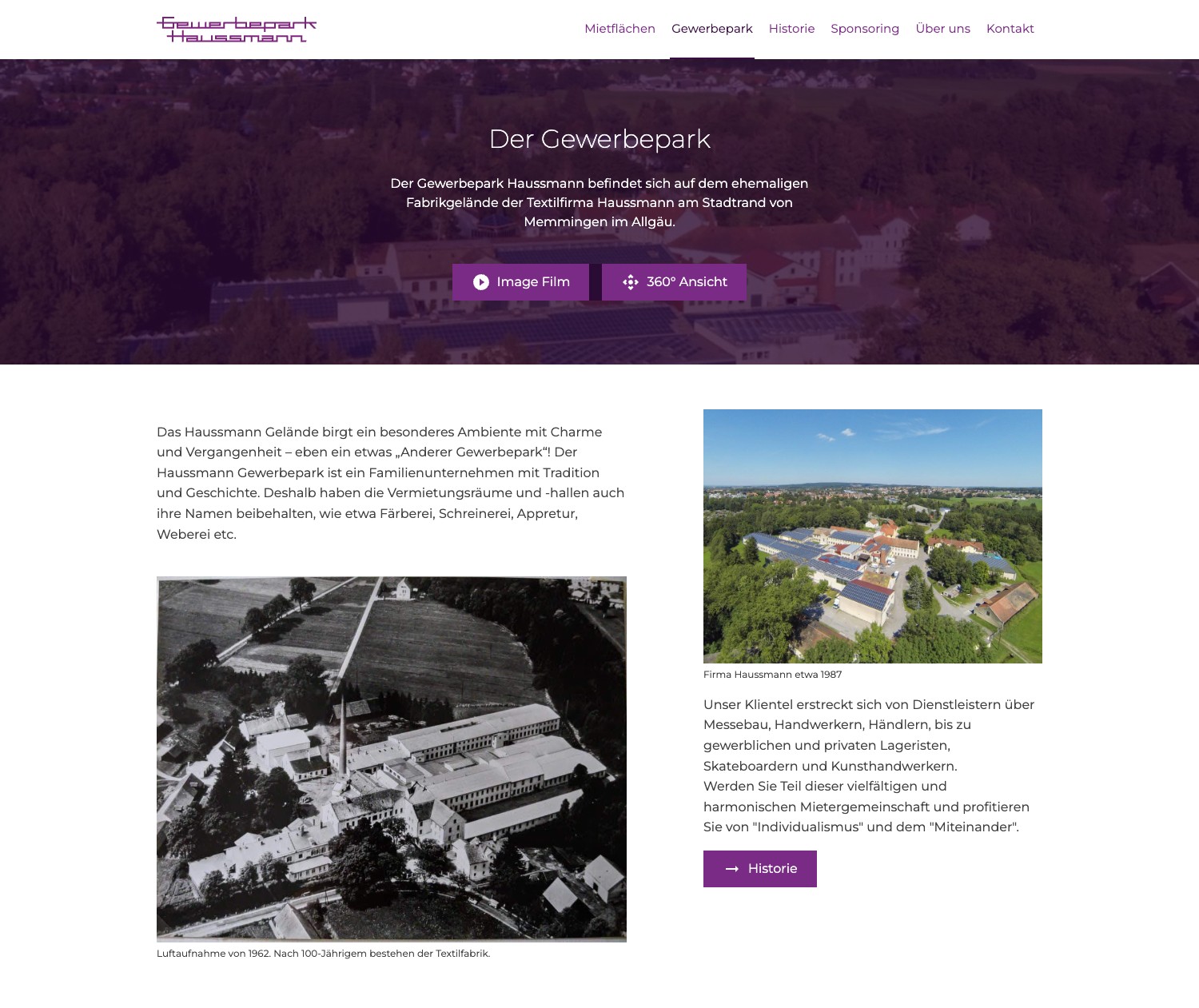 Familiengeführter Gewerbepark auf dem Gelände einer ehemaligen Textilfabrik (gegr. 1862) in Memmingen, betrieben von Steffi und Fritz Haußmann. 80 Mieteinheiten auf 17.698 m² Nutzfläche.