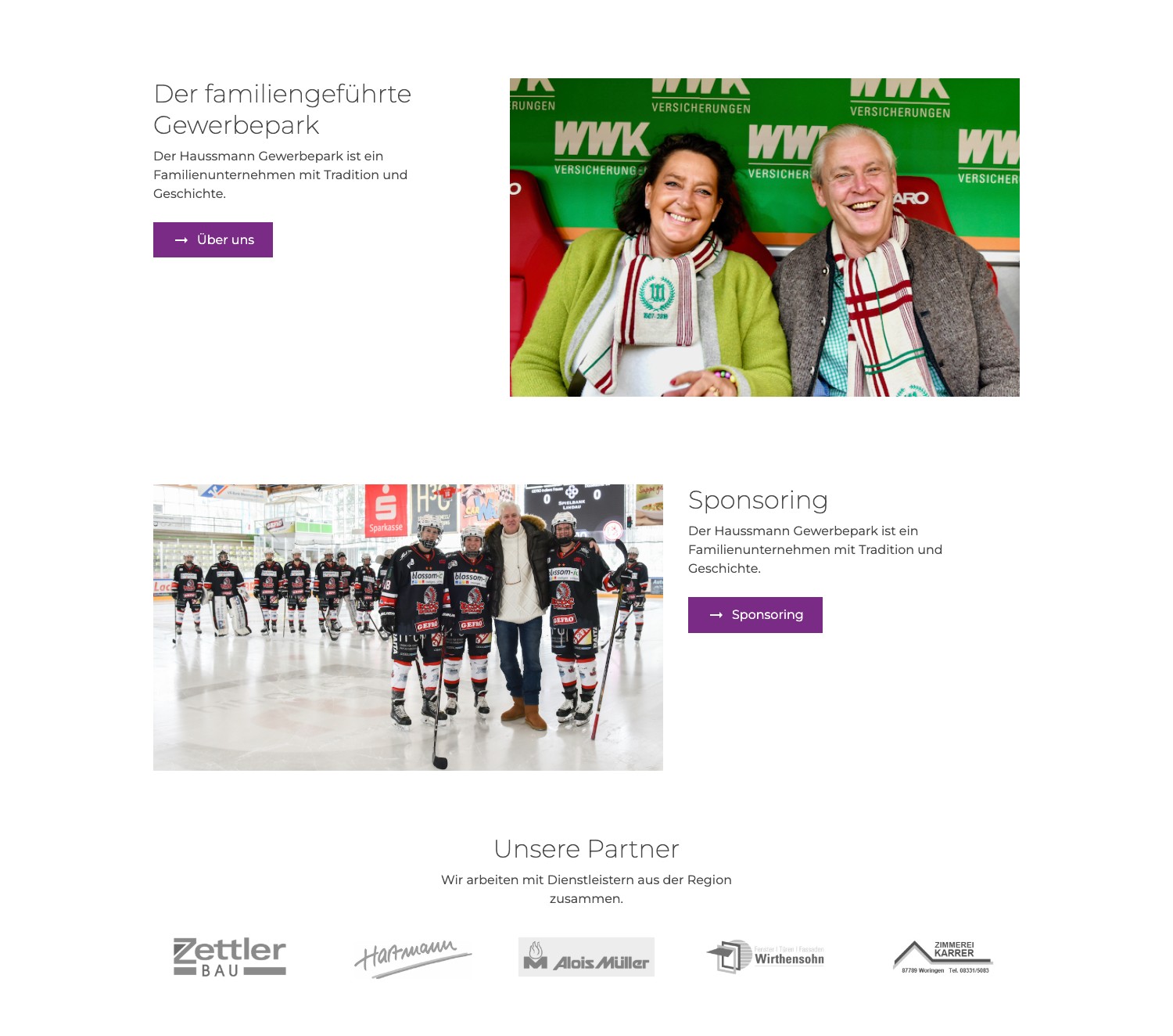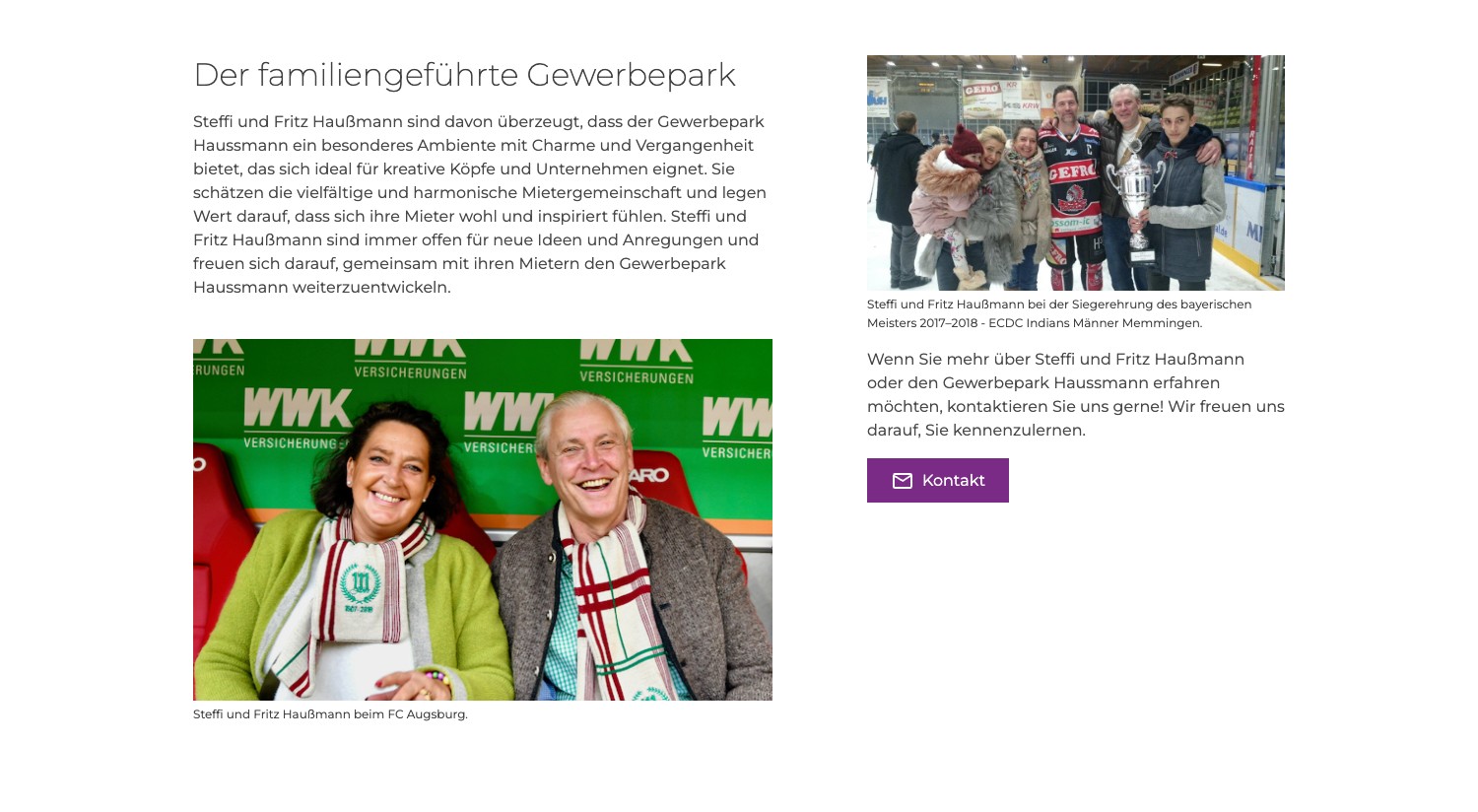 Eine eigene Seite zeigt das Engagement der Familie Haußmann in der Region – von den ECDC Indians über den FC Memmingen bis zum FC Augsburg. Das stärkt das Bild eines Gewerbeparks mit Gesicht und Haltung, nicht einer anonymen Vermietungsgesellschaft.