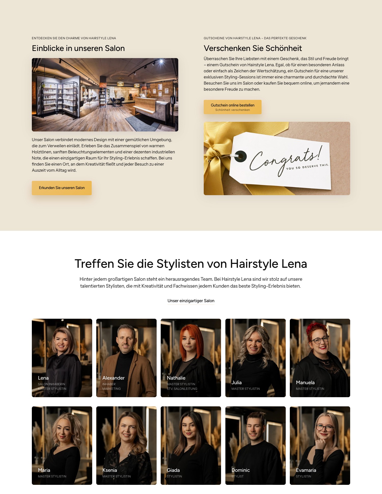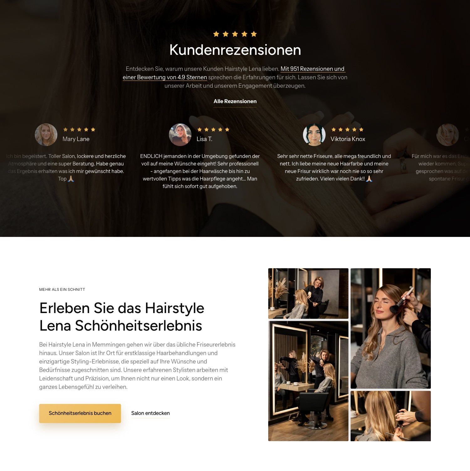 Echte Kundenstimmen und eine 4,9-Sterne-Bewertung sind prominent auf der Startseite eingebunden. Dazu: Teamfotos aller 14 Stylisten, Galerie mit aktuellen Kreationen und Einblicke in den Salon. Neue Besucher wissen sofort, was sie erwartet.