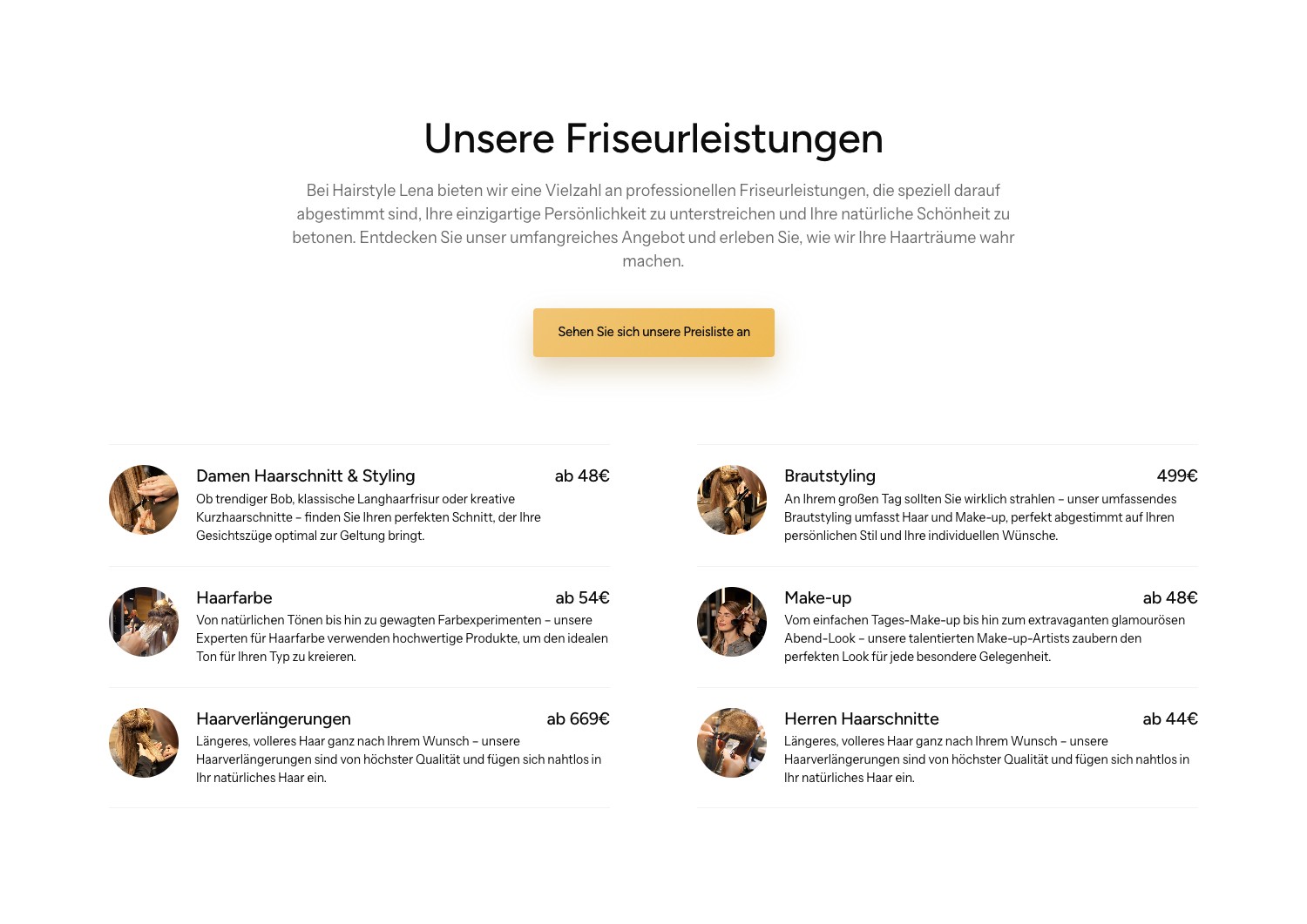 Alle Leistungen von Damen-Haarschnitt bis Brautstyling sind einzeln dargestellt und direkt online buchbar – kein Umweg über Telefon nötig.