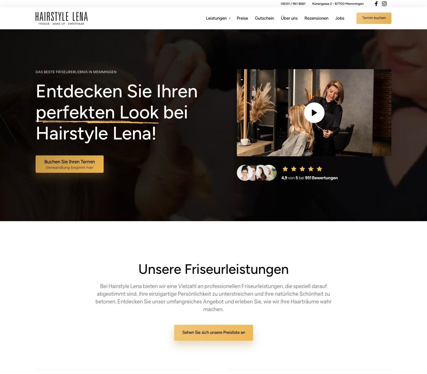 Hairstyle Lena war lokal bekannt, aber online kaum sichtbar. Die bisherige Webpräsenz bot wenig Orientierung – Leistungen, Preise und Termine waren schwer zu finden. Gleichzeitig war der Salon telefonisch oft schwer erreichbar, weil während der Öffnungszeiten alle Hände mit Kunden beschäftigt sind. Potenzielle Neukunden sprangen ab, bevor sie überhaupt den Weg in den Salon fanden.