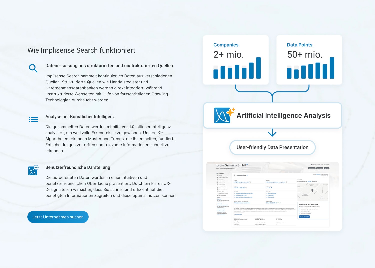 Flowcharts und animierte Dashboards zeigen visuell, wie Implisense arbeitet: von der Lookalike-Analyse über die Lead-Identifikation bis zur CRM-Integration. Komplexe Prozesse werden in Sekunden verständlich – ohne dass der Besucher eine Zeile Dokumentation lesen muss.