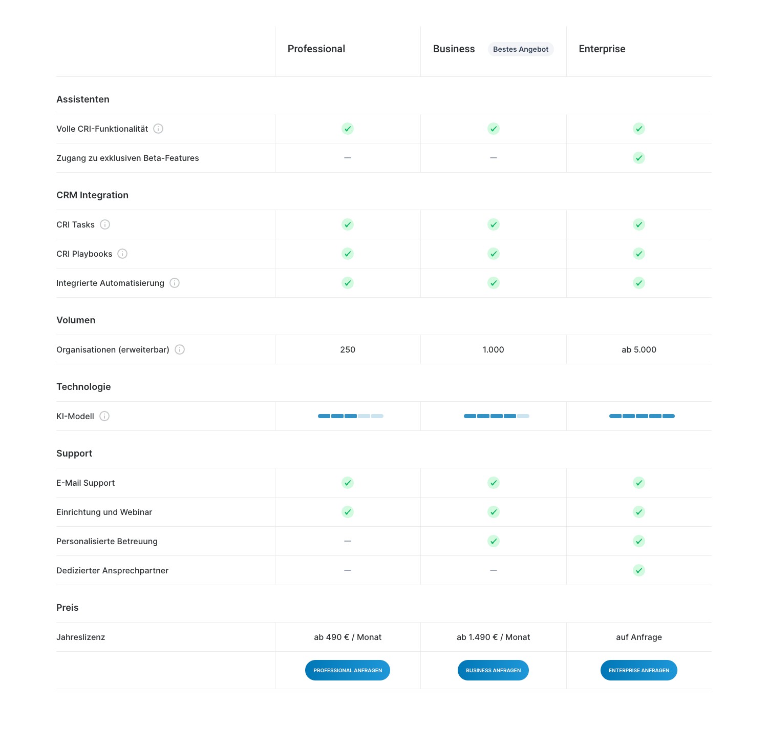 Vier Produkte (CRI, Search, API, Snowflake), mehrere Lösungen (Research, Contact Search, Lookalike Search, CRM Enrichment) – alles in eine Seitenarchitektur übersetzt, die Besucher nach Anwendungsfall statt nach technischen Features abholt. Wer auf die Seite kommt, findet innerhalb von Sekunden den passenden Einstieg.