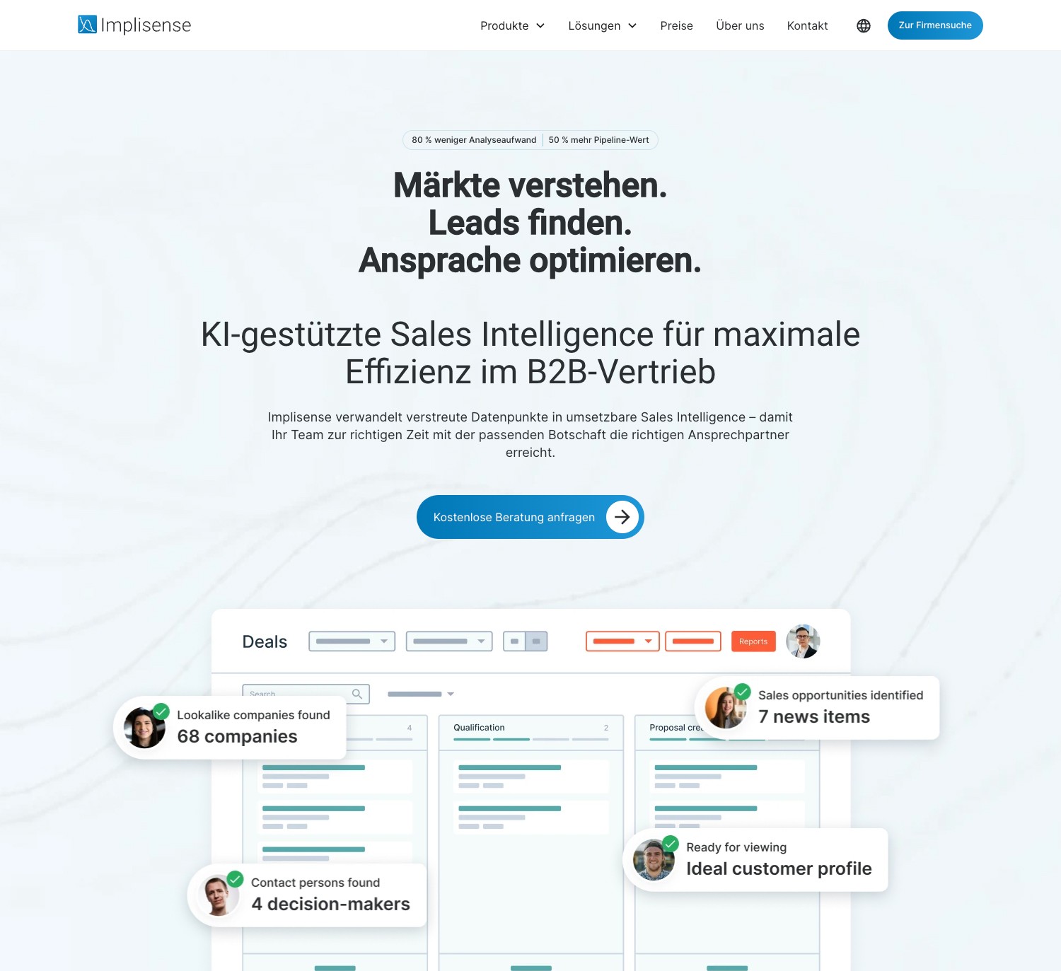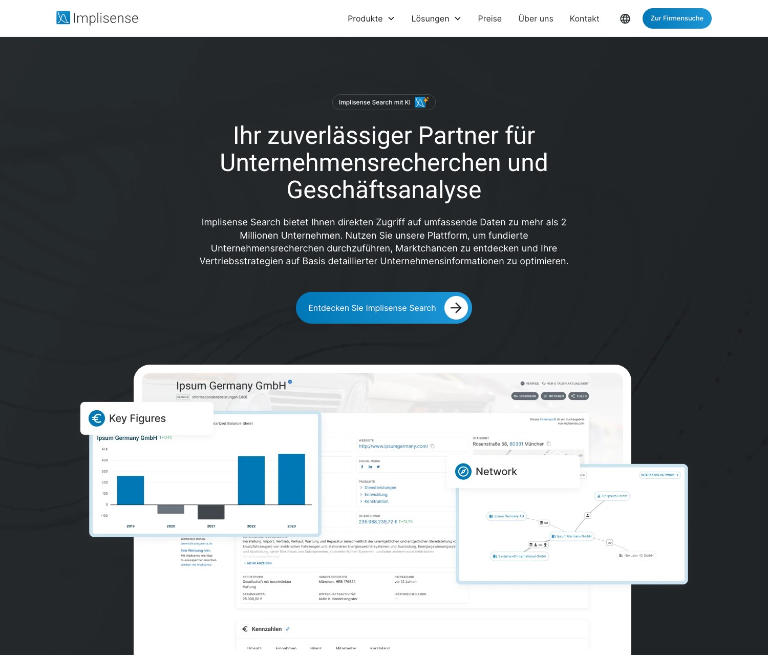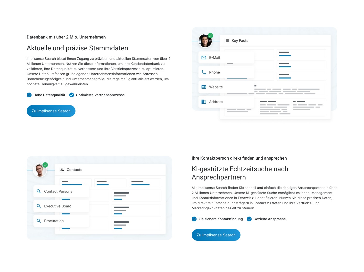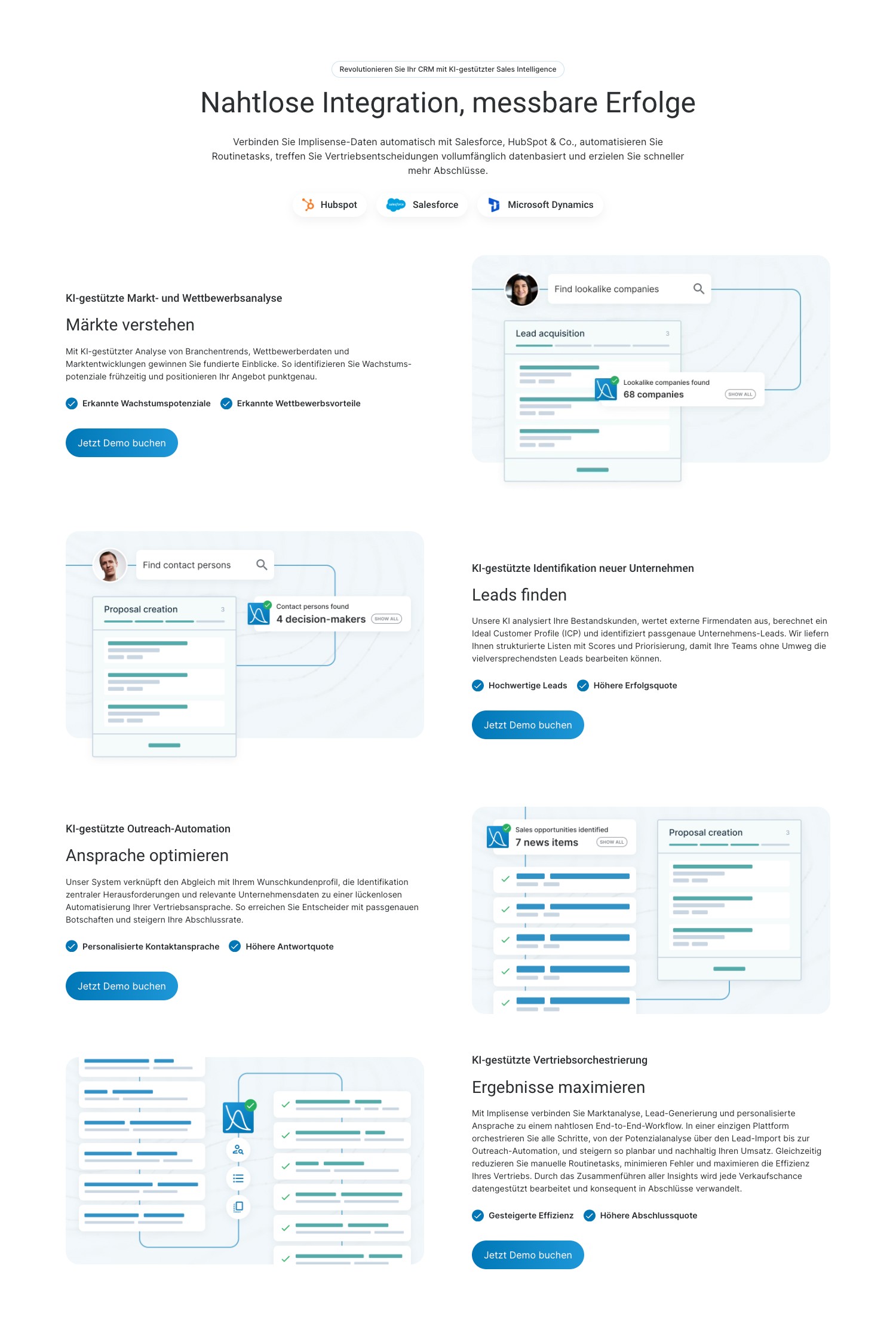 Implisense hatte ein starkes Produkt, aber die Website spiegelte das nicht wider. Die Plattform bietet KI-gestützte Sales Intelligence mit mehreren Produkten, CRM-Integrationen und einer umfangreichen Datenbank – doch für Besucher war schwer erkennbar, was Implisense konkret löst und für wen. Potenzielle Kunden mussten sich durch unklare Strukturen arbeiten, bevor sie verstanden, welches Produkt zu ihrem Anwendungsfall passt. Demo-Anfragen blieben unter dem Potenzial.