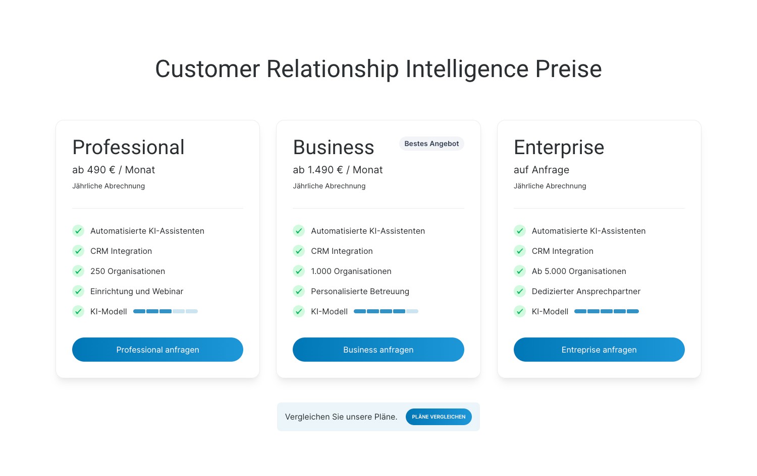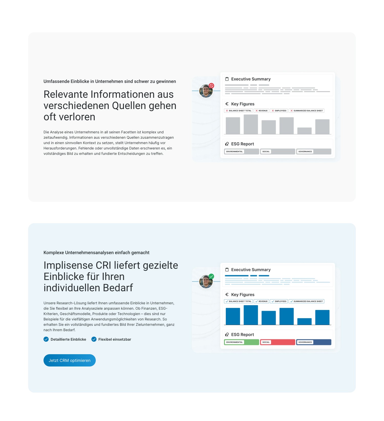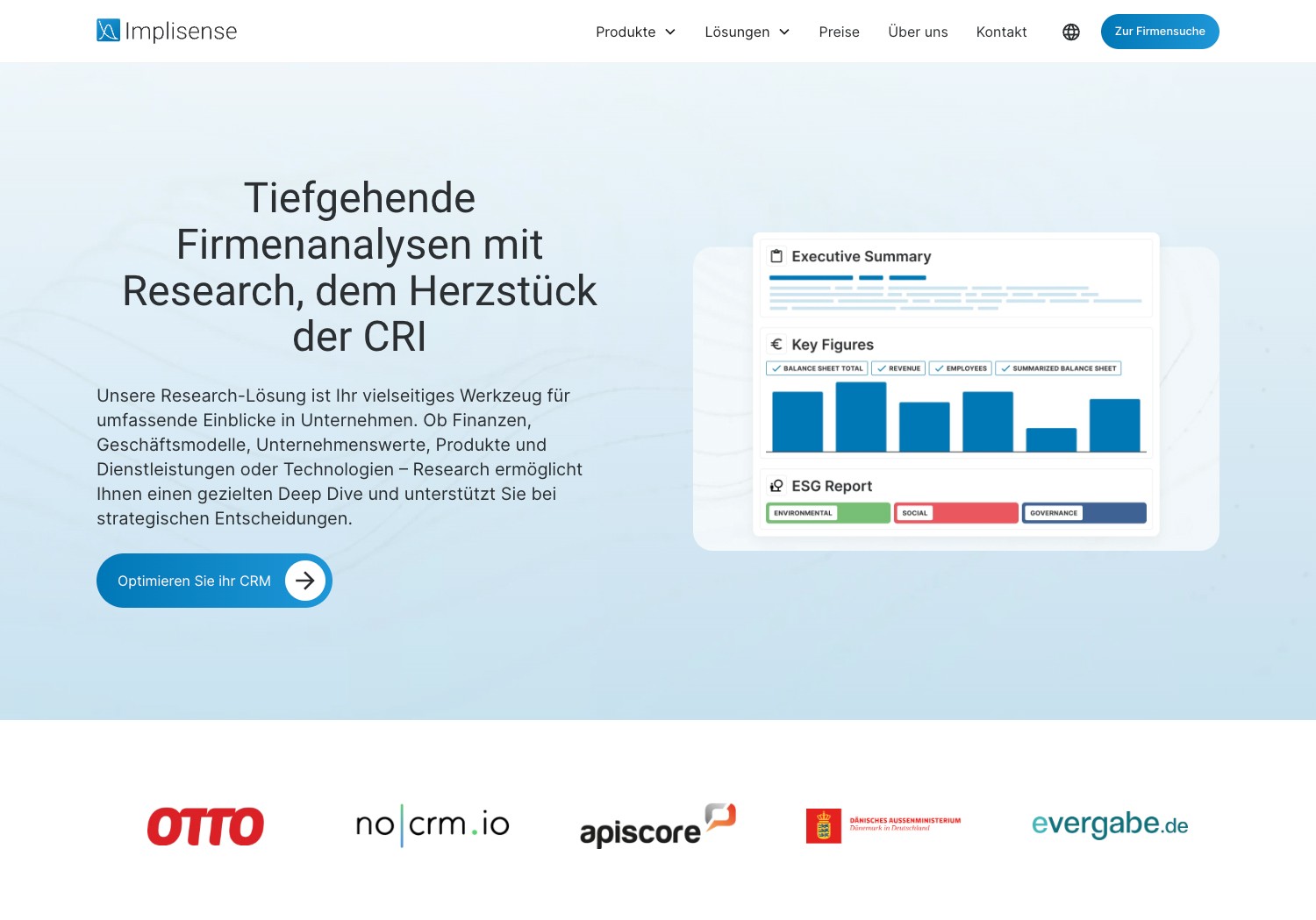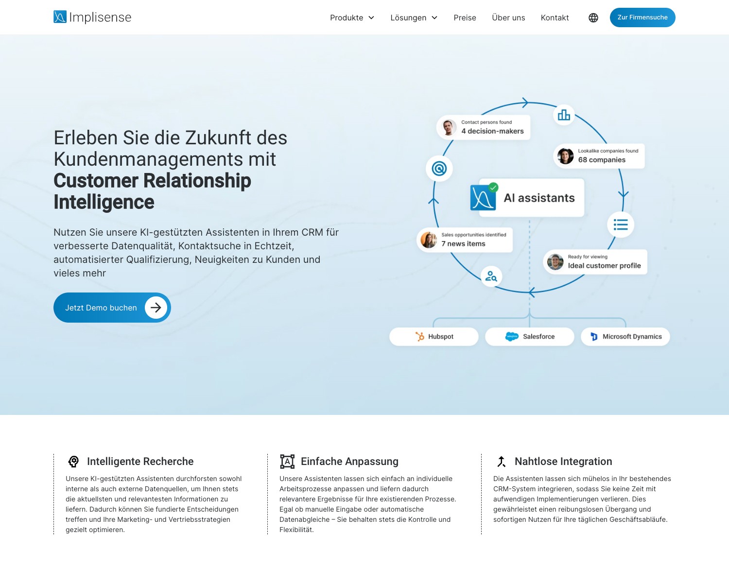 Implisense hatte ein starkes Produkt, aber die Website spiegelte das nicht wider. Die Plattform bietet KI-gestützte Sales Intelligence mit mehreren Produkten, CRM-Integrationen und einer umfangreichen Datenbank – doch für Besucher war schwer erkennbar, was Implisense konkret löst und für wen. Potenzielle Kunden mussten sich durch unklare Strukturen arbeiten, bevor sie verstanden, welches Produkt zu ihrem Anwendungsfall passt. Demo-Anfragen blieben unter dem Potenzial.