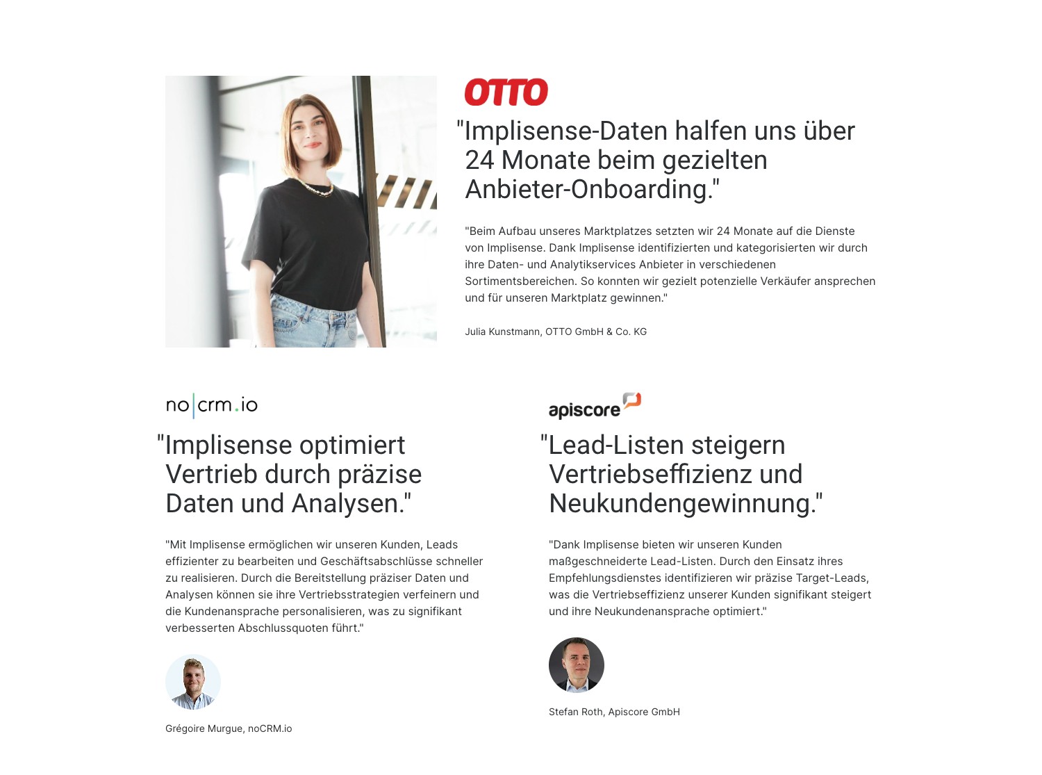 Kundenlogos (OTTO, noCRM.io, Apiscore, Dänisches Außenministerium), ausführliche Zitate mit Namen und Rolle, und konkrete Ergebnisse (z. B. „24 Monate gezieltes Anbieter-Onboarding" bei OTTO). Das signalisiert neuen Interessenten: Hier arbeiten Unternehmen unserer Größenordnung bereits erfolgreich.